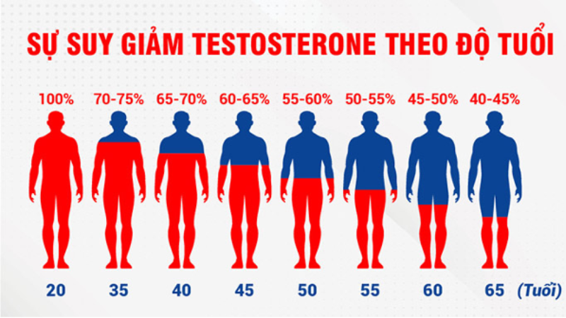 - Lão hóa: tuổi càng cao sẽ dẫn đến sự suy giảm về hoạt động và chức năng của trục dưới đồi – tuyến yên – tinh hoàn làm cho cơ thể giảm sản xuất testosterone. Từ sau tuổi 30, cùng với quy luật tự nhiên của cơ thể, lượng testosterone được sản sinh ngày một ít dần, trung bình giảm 1% sau mỗi năm.
