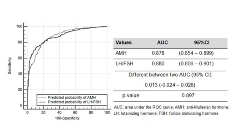Bên cạnh đó, khi nồng độ AMH tăng 1 ng/mL thì nguy cơ mắc HCBTĐN tăng lên gấp 1,63 lần (KTC 95%: 1,506-1,764; p < 0,001). Tượng tự, sự gia tăng tỷ số LH / FSH lên 1 đơn vị cũng gây ra sự tăng nguy cơ mắc HCBTDN gấp 14,433 lần (KTC 95%: 9,302-22,395; p < 0,001). Tuy nhiên, không có sự khác biệt trong chẩn đoán HCBTĐN giữa hai giá trị AMH và tỷ số LH/FSH, vì sự khác biệt giữa hai AUC là 0,013, KTC 95%: -0,024 - 0,028 và p = 0,897.